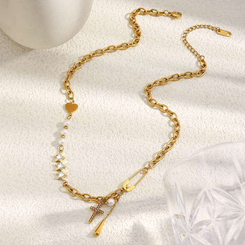 Креативное колье-подвеска в форме сердца и звезды с крестом, позолоченное 18-каратным золотом PVD, с жемчугом, из нержавеющей стали, для женщин