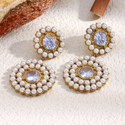 Креативные серьги с жемчугом и цирконом, длинные висячие серьги-подвески, круглые, с PVD-покрытием из 18-каратного золота, из нержавеющей стали, для женщин